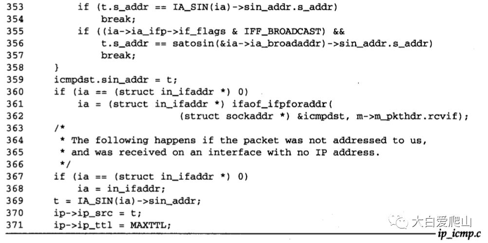 346~371 icmp_reflect在in_ifaddr中找到具有单播或者广播地址的接口,该接口地址与原始数据报的目的地址匹配,这样icmp_reflect就为报文选好源地址。在多接口主机上,匹配的接口可能不是接收该数据报的接口。如果没有匹配,就选择正在接收的接口的in_ifaddr结构,或者in_ifaddr中的第一个地址。该函数把ip_src设成所选的地址,并把ip_ttl改为255,因为这是一个新的数据报。