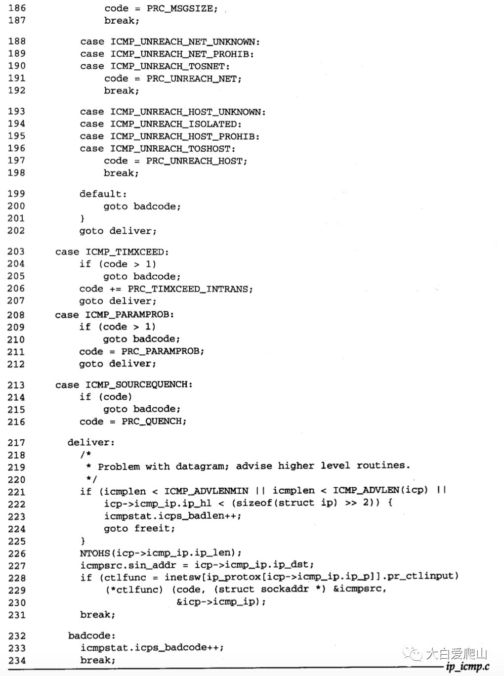 226~231 icmp_input调用运输层协议的pr_ctlinput函数,该函数根据原始数据报的ip_p,把到达分组分用到正确的协议,从而构造出原始的IP数据报。差错码(code)、原始IP数据报的目的地址(icmpsrc)以及一个指向无效数据报的指针(icmp_ip)被传给pr_ctlinput。