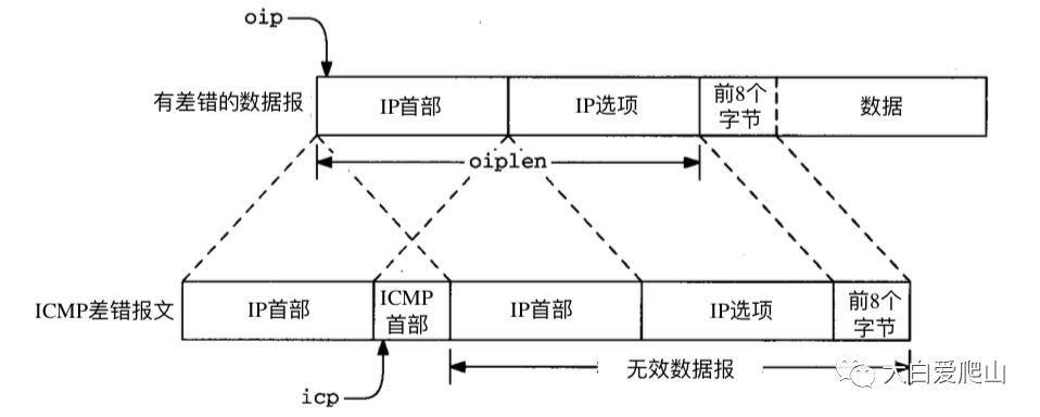 因为MH_ALIGN把ICMP报文分配在缓存的最后,所以缓存的前面应该有足够的空间存放IP首部。无效数据报的IP首部(除选项外)被复制到ICMP报文的前面。