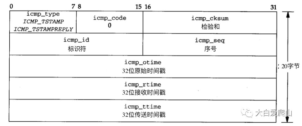 icmp_code总是0。icmp_id和icmp_seq的作用与它们在ICMP回显报文中的一样。请求的发送方设置icmp_otime(发出请求的时间);icmp_rtime(收到请求的时间)和icmp_ttime(发出回答的时间)由回答的发送方设置。所有时间都是从UTC午夜开始的毫秒数。