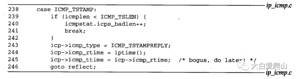 238~246 icmp_input对ICMP的响应,包括:把icmp_type改为ICMP_TSTAMPREPLY,记录当前icmp_rtime和icmp_ttime,并跳转到reflect发送回答。