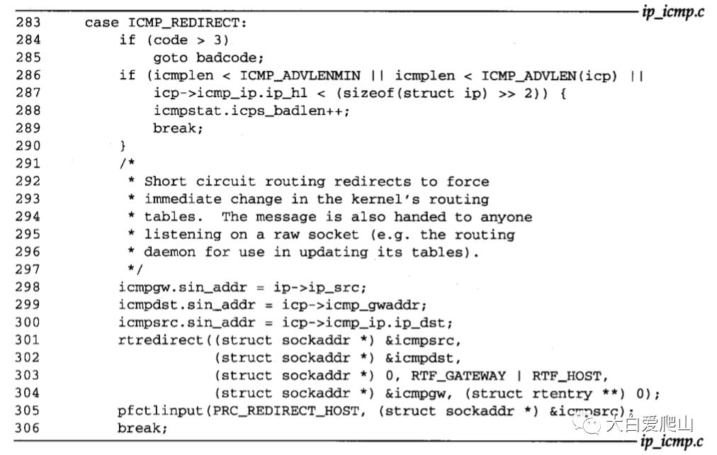 291~300 icmp_input分别把重定向报文的源站地址,为原始分组推荐的路由器(第一跳目的地)和原始分组的最终目的地址分配给icmpgw、icmpdst和icmpsrc。