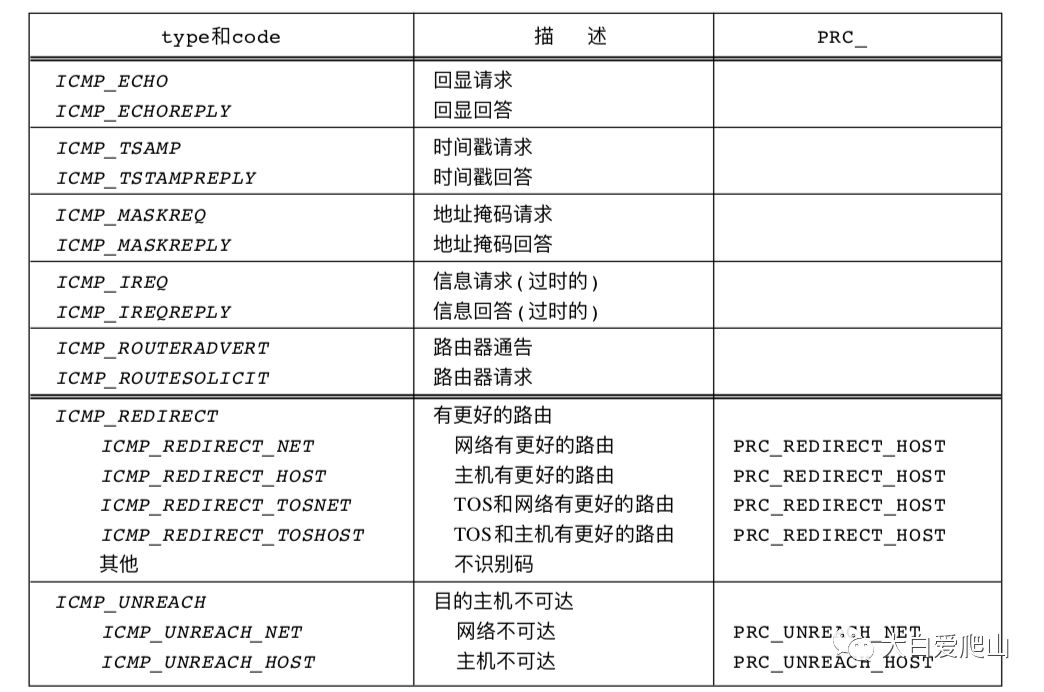 PRC_栏显示了Net/3处理的与协议无关的差错码和ICMP报文之间的映射。对请求和回答,这一列是空的,因为这种情况下不会产生差错。如果对一个ICMP差错,这一行为空,说明Net/3不识别该码,并自动丢弃该差错报文。