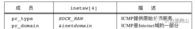 inetsw[4](图9)的protosw结构描述了ICMP,并且支持内核和进程对协议的访问。图8显示了该结构。在内核里,icmp_input处理到达的ICMP报文,进程产生的外出ICMP报文由rip_output处理。