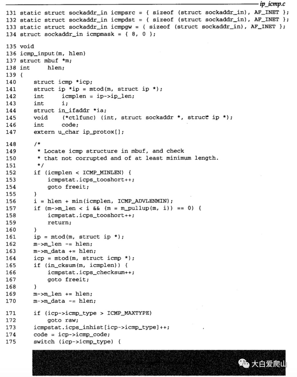 140~160 icmp_input从ip_len取出ICMP报文的大小,并把它存放在icmplen中。第8章讲过,ipintr从ip_len中排除了IP首部的长度。如果报文长度太短,不是有效报文,就生成icps_tooshort,并丢弃该报文。如果在第一个mbuf中,ICMP首部和IP首部不是连续的,则由m_pullup保证ICMP首部以及封装的IP分组的IP首部在同一个mbuf中。