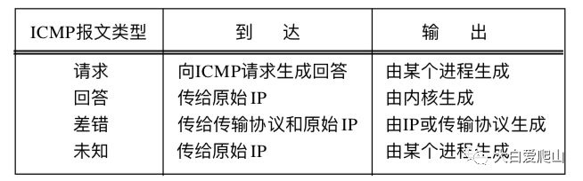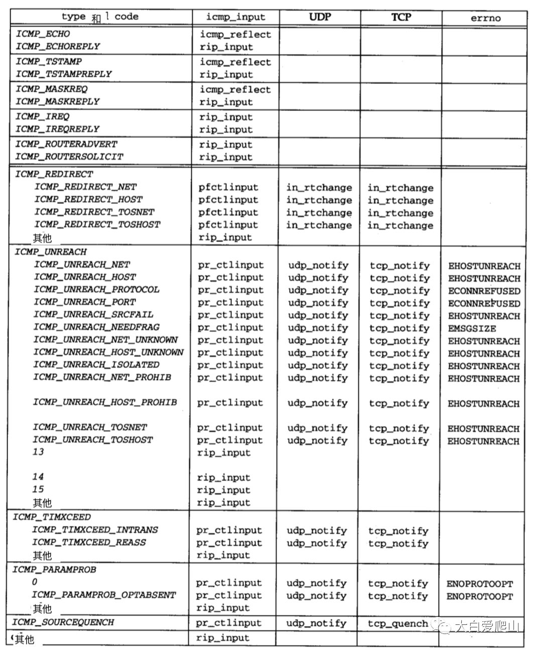 表的最后一行显示,在用于接收ICMP报文的进程的接收点上,不识别的ICMP报文被提交给原来的IP协议。