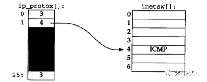 回想起ipintr对数据报进行分用是根据IP首部中的传输协议编号ip_p。对于ICMP报文,ip_p是1,并通过ip_protox选择inetsw[4]。