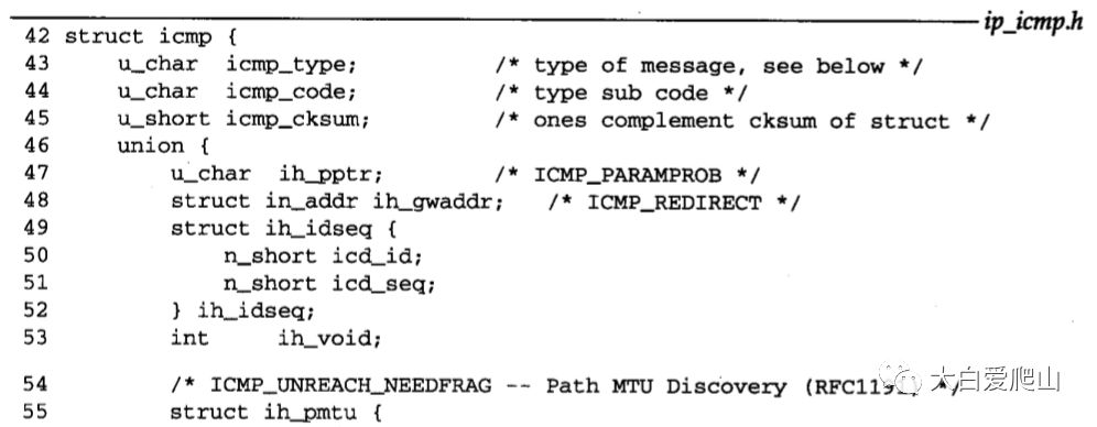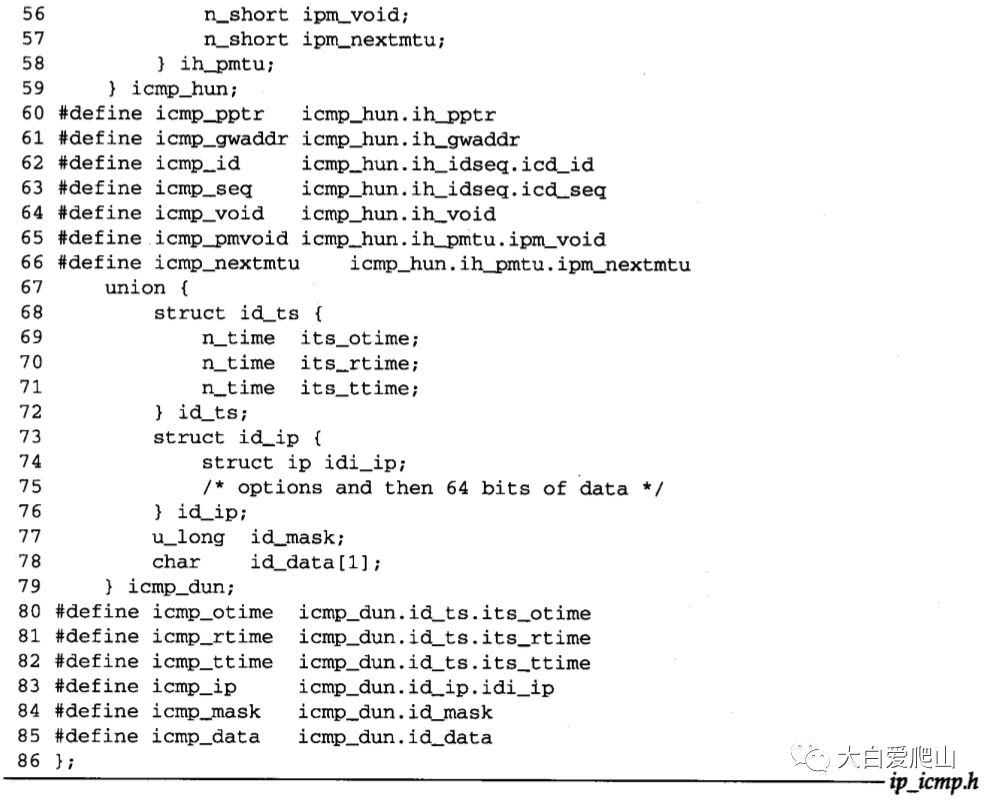 46~79 联合icmp_hun(首部联合)和icmp_dun(数据联合)根据icmp_type和icmp_code访问多种ICMP报文。每种ICMP报文都使用icmp_hun;只有一部分报文用icmp_dun。没有使用的字段必须设置为0。