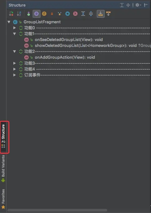 cmd + 7或者直接点击左边structure面板,查看划分好的功能区域