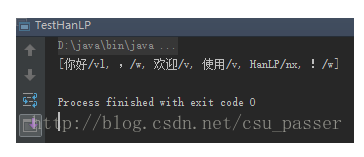 public class TestHanLP { public static void main(String[] args) { System.out.println(HanLP.segment("你好,欢迎使用HanLP!")); } }