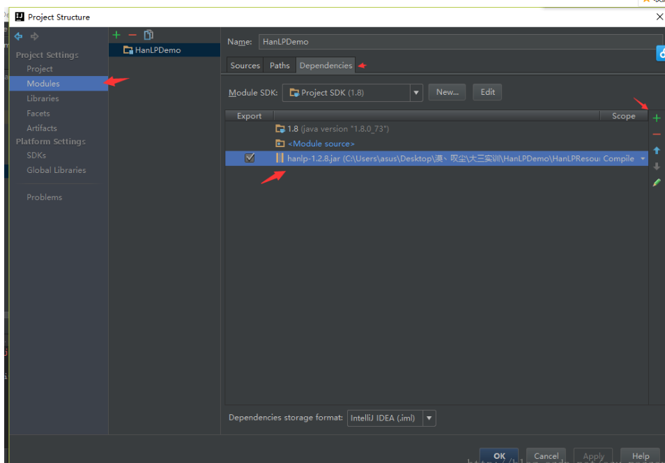 在项目中配置jar包,添加依赖。 file->Project Structure->Modules->Dependencies->+Jars