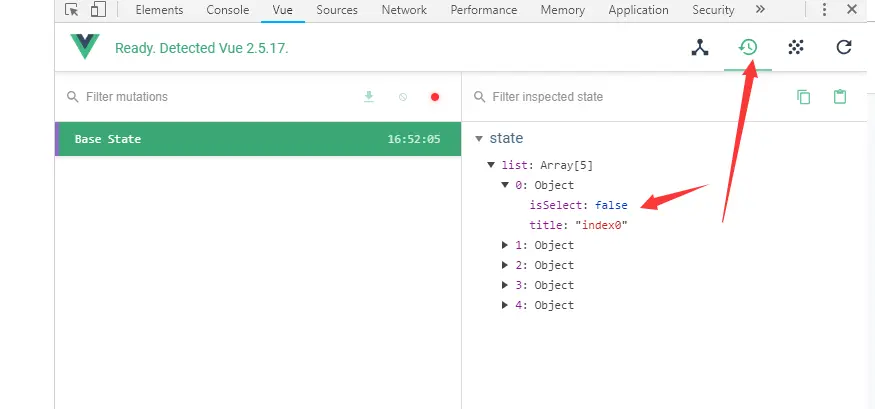 但是有一点, 在使用vue-devtools工具的中会有点差异,简单来说通过这种方式修改了state中的值,在vue-devtools工具的vuex部分是不会更新的, 但是实际上数据是已经改变了。。 依旧是先前的那个例子, 我们将数据源从data改为vuex