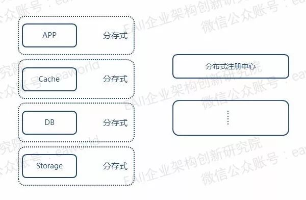 从图上可以看到,APP这一层就是一个简单的分布式。这也许是我们经常部署的一种典型的架构。简单的将APP这层进行了分布式的设计。而其他的组件还是沿用传统集群的部署模式,但在这种架构的部署模式下,增加了运维的难度。