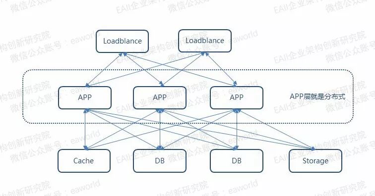 复杂的分布式在图中看起来比简单分布式要简单。但在实践中会发现这个会很难。因为APP、Cache、DB、Storage等等都是分布式的,这样复杂对于架构上提出了很高的要求,同时对于运维也增加了难度。图上画的比较少,但实际上复杂的分布式比这要多的多。