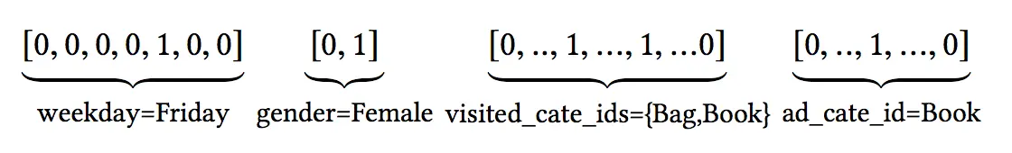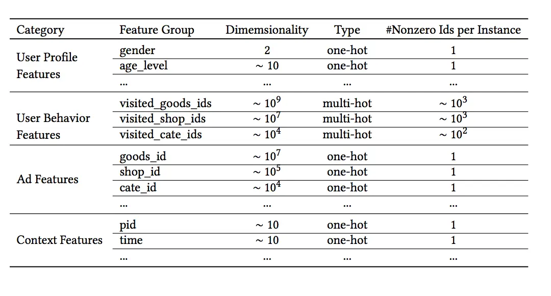 输入排序算法的feature大部分情况下是multi-group categorical form,它们被one-hot或者multi-hot形式表示出来,一个典型的输入如下: