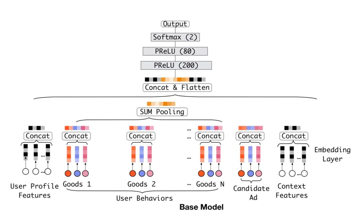淘宝本来使用的是一个Embedding&MLP模型,我们在这里称这个model为Base Model。这个model由如下几部分构成: