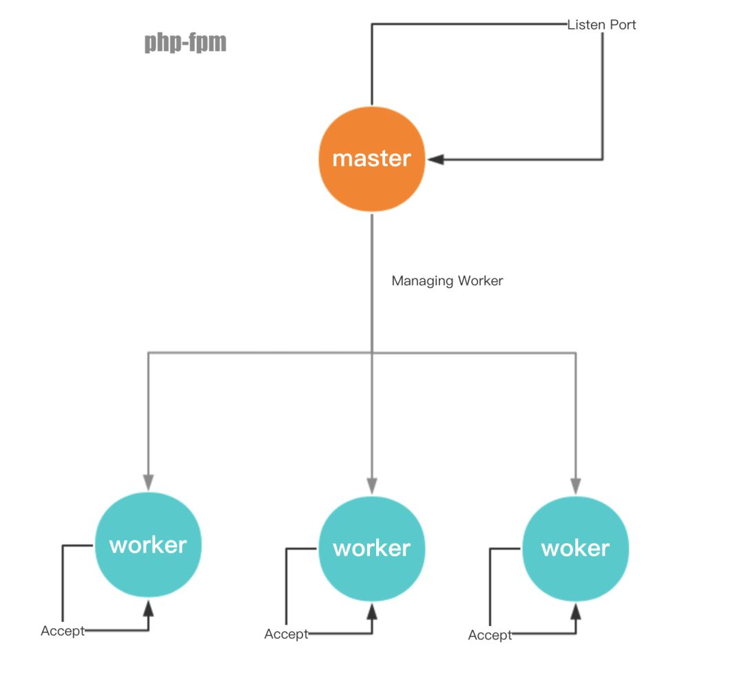 php-fpm采用了master-worker多进程的模型,其次与php-cgi相比提供了更好的进程管理方式。php-fpm的进程模型示例图如下: