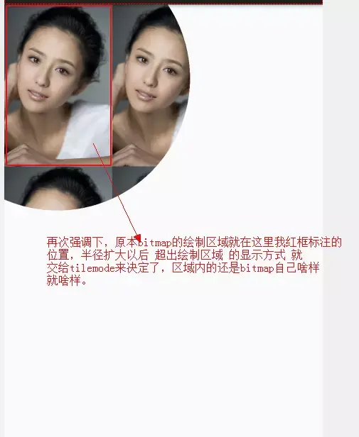 然后我们再想看看tilemode的效果怎么办?其实这里的tilemode效果和上面讲的渐变的tilemode是一样的, 超出原本的bitmap绘制区域 才能看到效果噢,所以我们把半径放大就可以看到tilemode的效果了