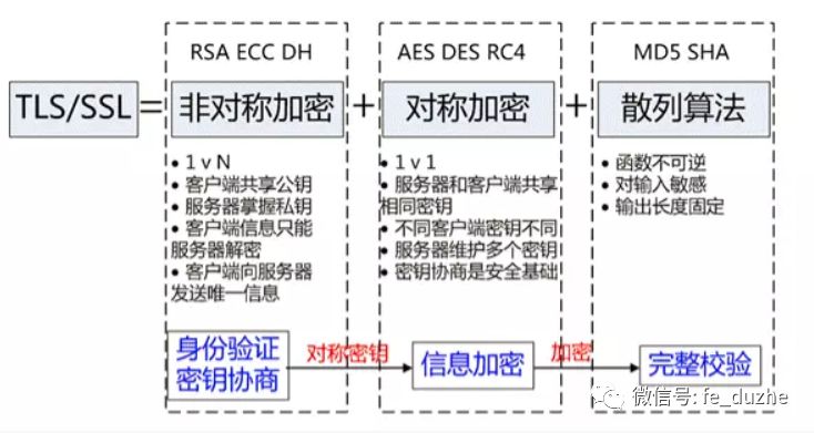 HTTPS 协议的主要功能基本都依赖于 TLS/SSL 协议,TLS/SSL 的功能实现主要依赖于三类基本算法:散列函数 、对称加密和非对称加密,其利用非对称加密实现身份认证和密钥协商,对称加密算法采用协商的密钥对数据加密,基于散列函数验证信息的完整性。