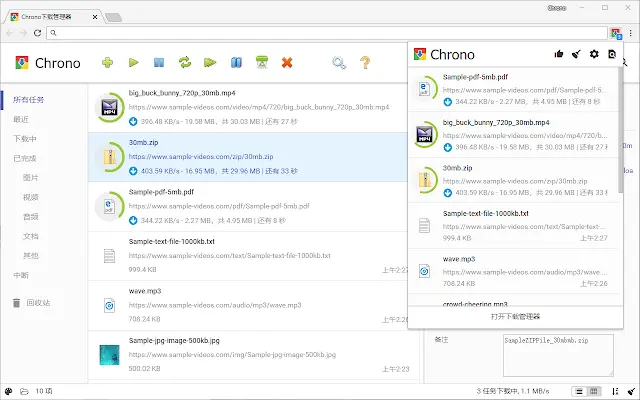 Chrono下载管理器是Chrome浏览器下第一款(也是唯一一款)功能全面的下载管理工具。Chrono接管你在Chrome中的所有下载,你的所有下载管理工作都在浏览器中完成,而不需要安装另外的程序。Chrono与Chrome浏览器紧密地整合在一起,添加了对浏览器菜单、工具栏和快捷键的支持。