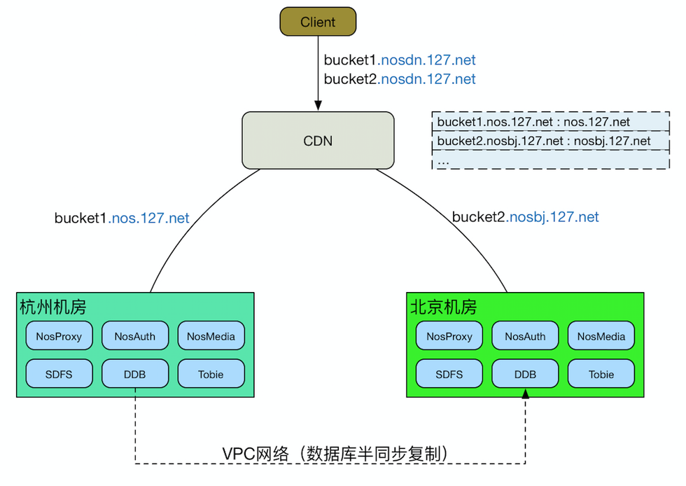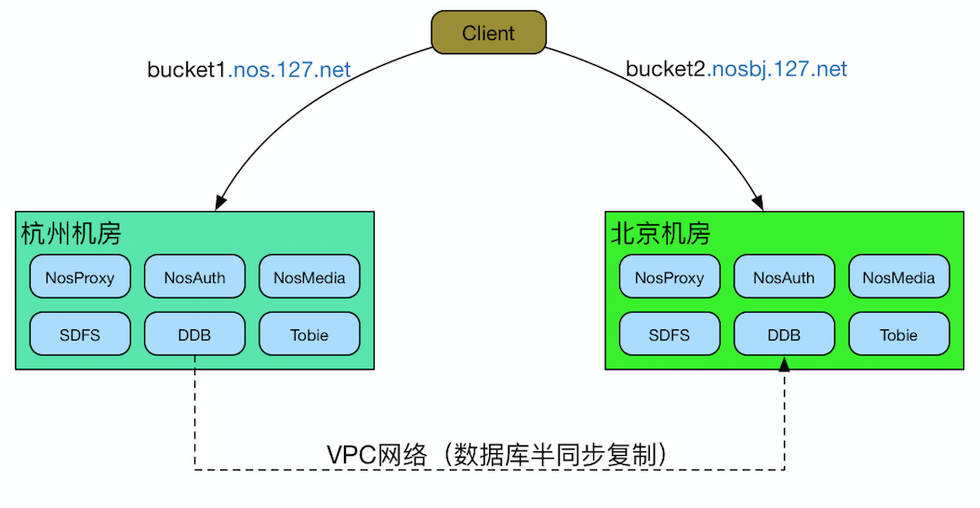 如图,两个机房间除了极少量的信息(桶信息)需要同步外,各自都相当于一套独立的NOS集群。