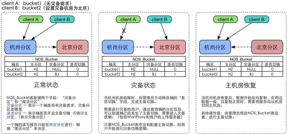 NOS(网易对象存储)在实现多机房(杭州机房,北京机房等)部署后,允许一个用户在建桶时选择桶所属机房。在此基础上,我们实现了跨机房的数据复制,进一步实现了跨机房的数据灾备方案。用户可以: