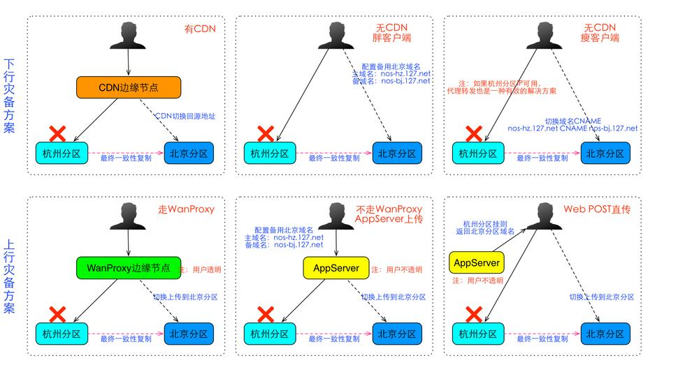 基于以上的讨论,我们未来推荐的方式将是,客户端通过WanProxy进行上传,通过CDN进行下载,将灾备的逻辑统统交给NOS来做。