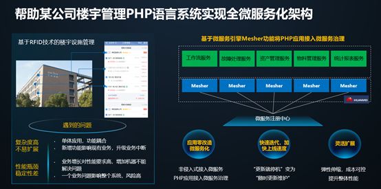 后来他们在启动改造开发的时候,又发现当前业界还没有合适的PHP语言微服务框架,而当前他们开发人员的技术栈都是PHP语言的,这时候要换语言或者换人都是成本比较高的,于是他们找到了华为通过Mesher来解决微服务化的问题。