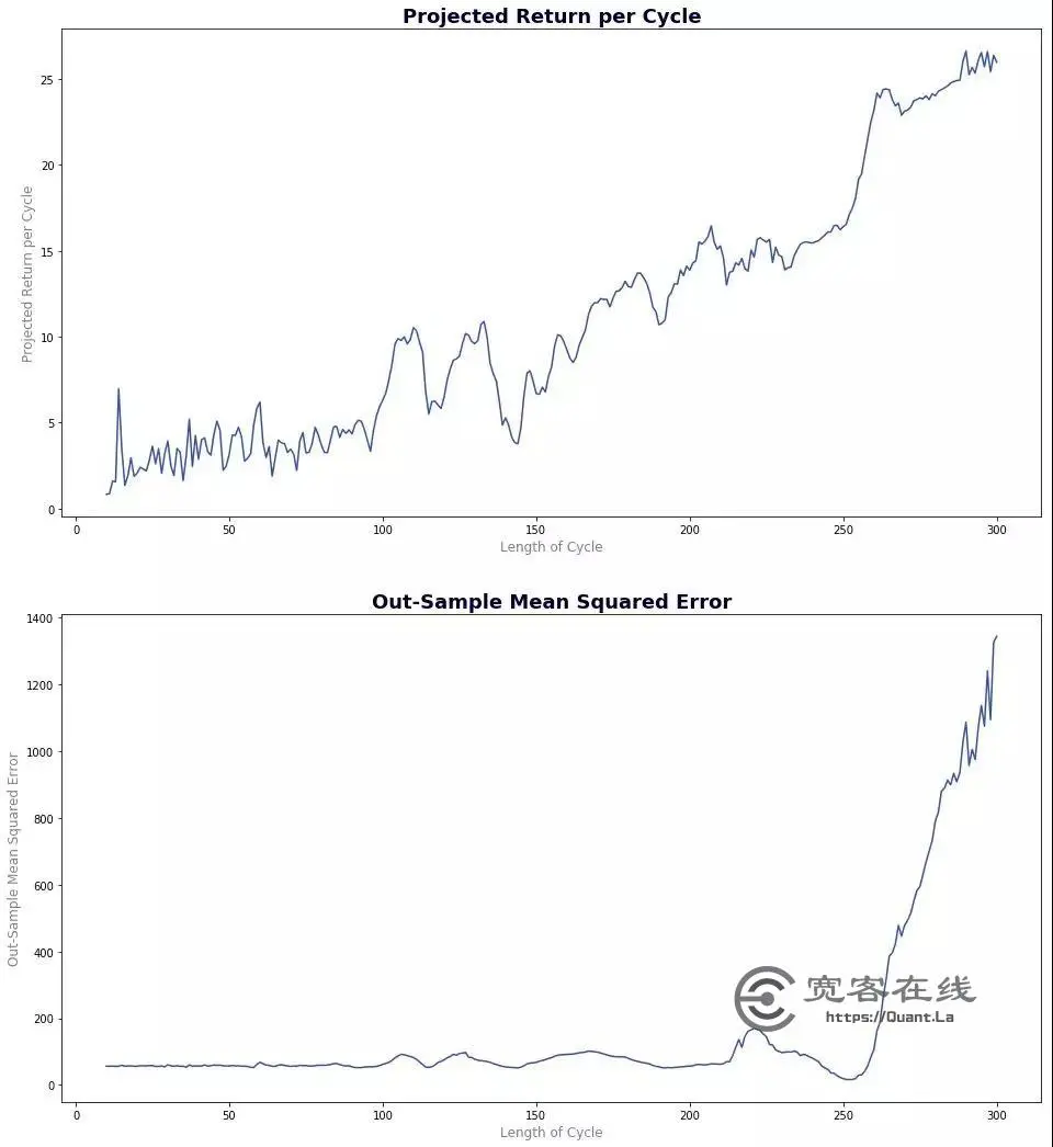 我们可以在cycle_analysis函数上应用一个循环来计算不同循环长度的预计回报和样本均方误差,并且我们在下图中显示了结果。正如我们所看到的,长度越长,每个周期的预计回报和样本均方误差会增加。 考虑到交易成本,每个周期内的预计回报应该大于10元。 在这种约束下,我们可以选择最小样本均方误差的周期,并且它是252天。 每个周期的预计回报为17.12元,样本均方误差为15.936。 两者都很不错!