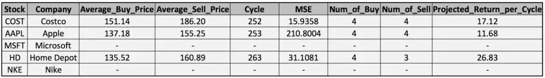 更多股票的应用 当然,这种方法可以应用于尽可能多的股票。 我们列出了Costco,Apple,Microsoft,Home Depot和Nike的平均购买价格,平均销售价格,周期长度,样本均方误差,购买数量,销售数量和每个周期内的预计回报。