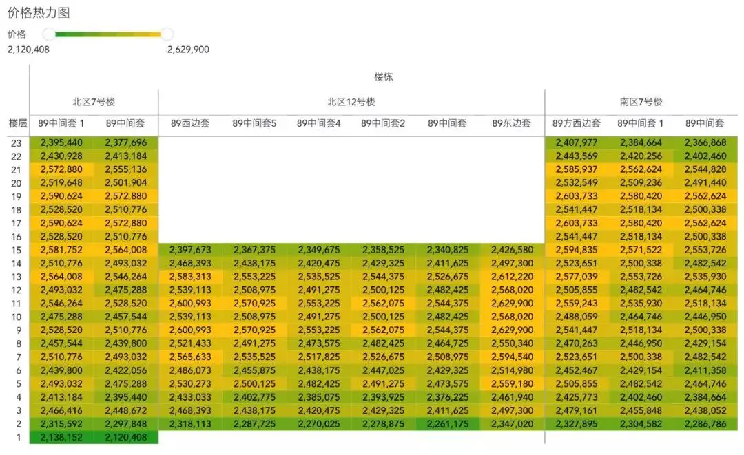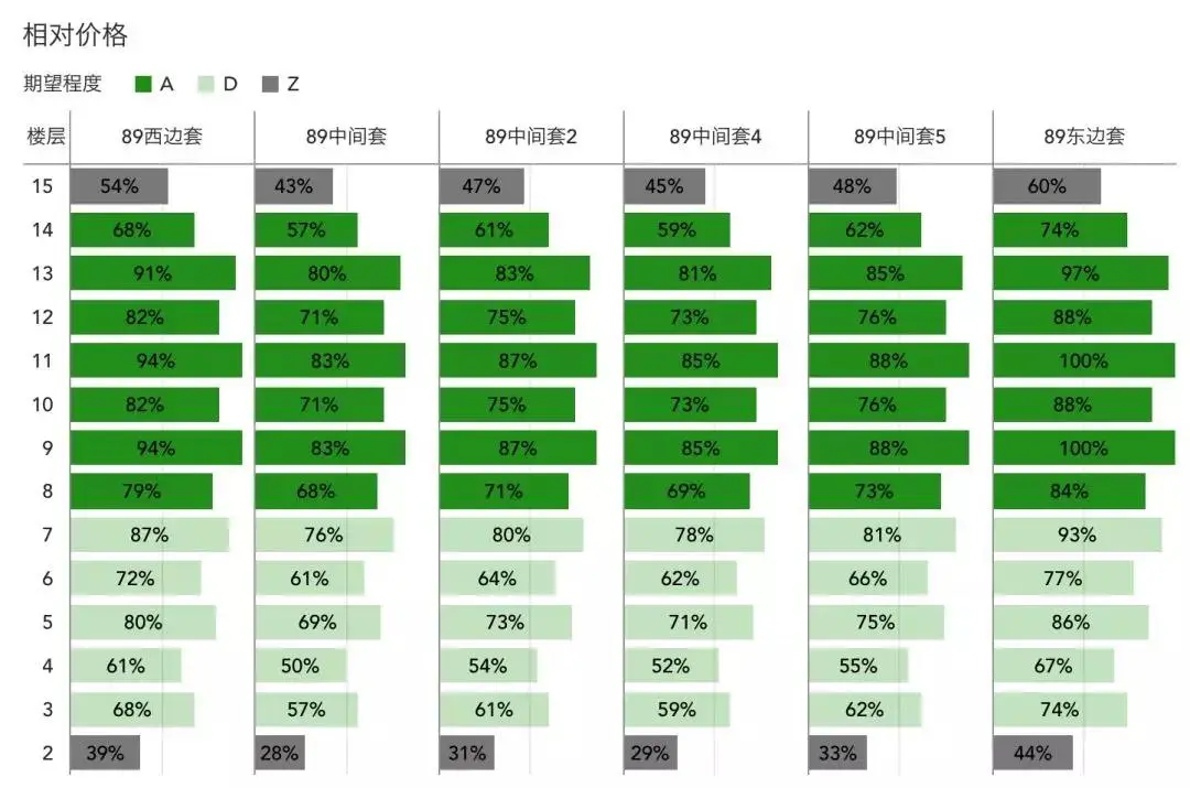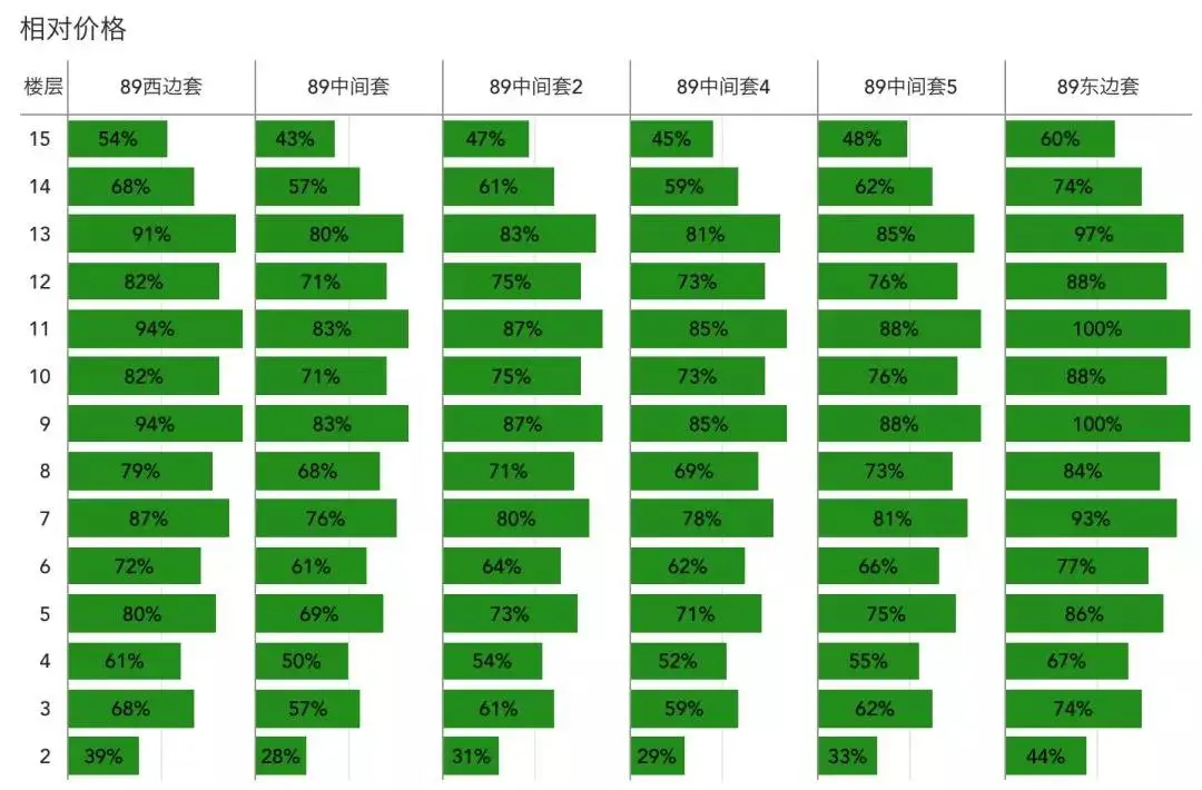 通过下图可以让我们对每个房间的相对价格一目了然,100%表示是小区内最贵的,0%表示是小区内最便宜的。可以看到顶楼的相对价格较低,如果不在意顶楼的一些缺陷(夏季较热、有漏水风险),那么相对价格较低、视野较好的顶楼不失为性价比较高的选择。