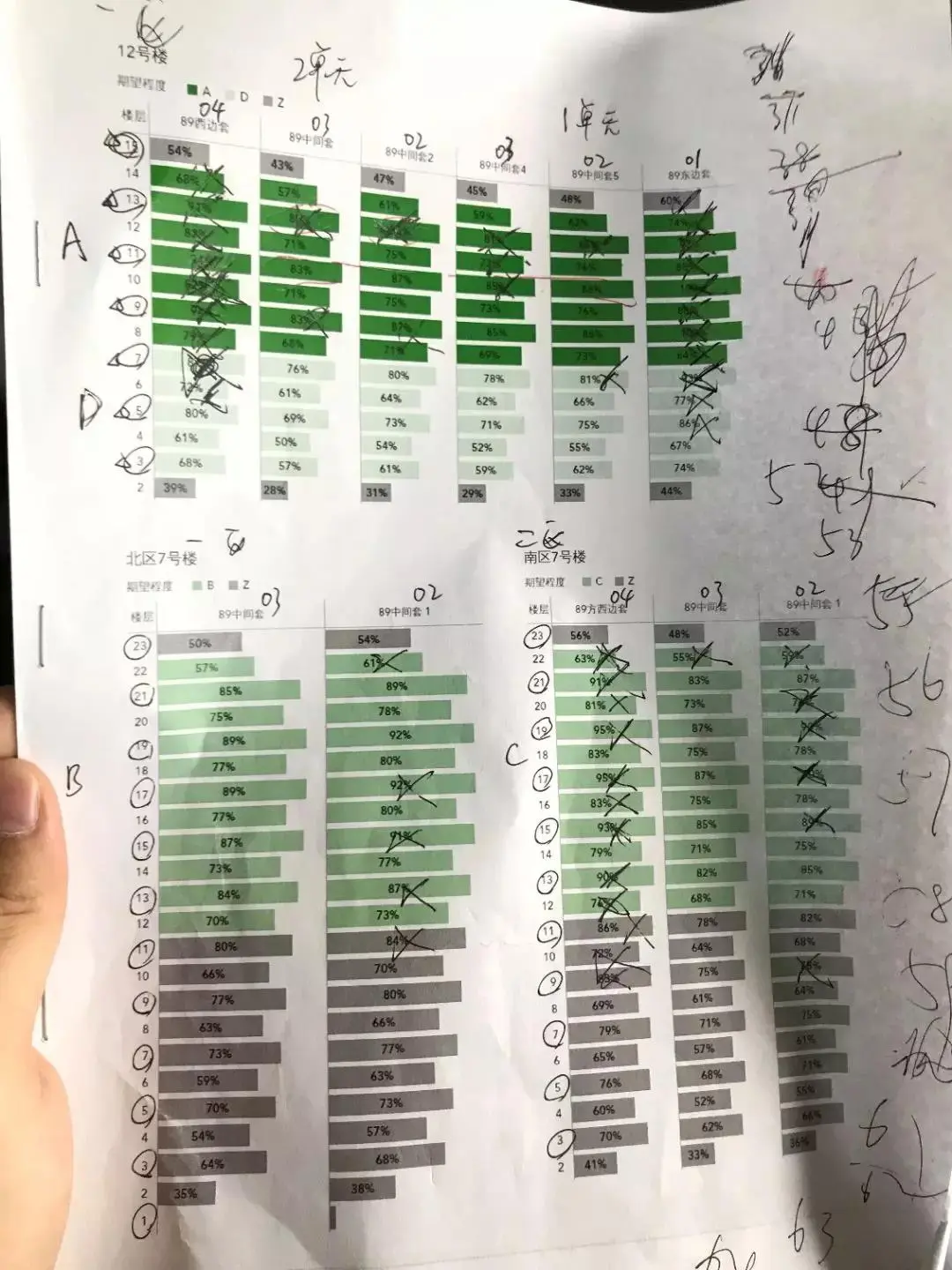 最后将制作好的图表打印出来,一张A4纸足矣。选房现场,有一套房子被选掉,就在图上把对应的房子叉掉。这样轮到自己选房时,还剩哪些可选项,以及每间房子自己的期望度跟性价比都一目了然。如此一来,挑中自己满意房子的概率大大提升。