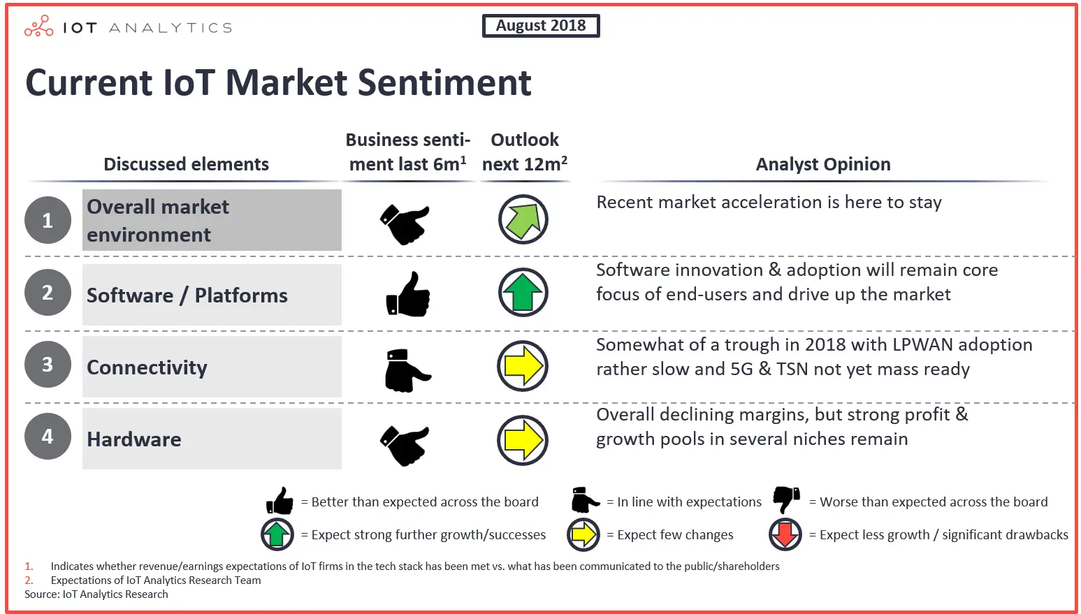 目前的市场情绪和短期前景非常乐观。随着越来越多的数据转移到云端,新的物联网应用程序进入市场,分析越来越重要,软件和平台将继续推动市场的发展。 随着物联网设备数量的增加推动销售,但硬件利润率普遍下降,连接和硬件的12个月前景保持稳定。一些硬件专业提供商(例如NVIDIA)似乎不需要硬件商品化。随着LPWA技术刚刚推向全球市场,而5G还没有大规模准备就绪,连接播放器预计将在2019年及之后的几年内出现差距。