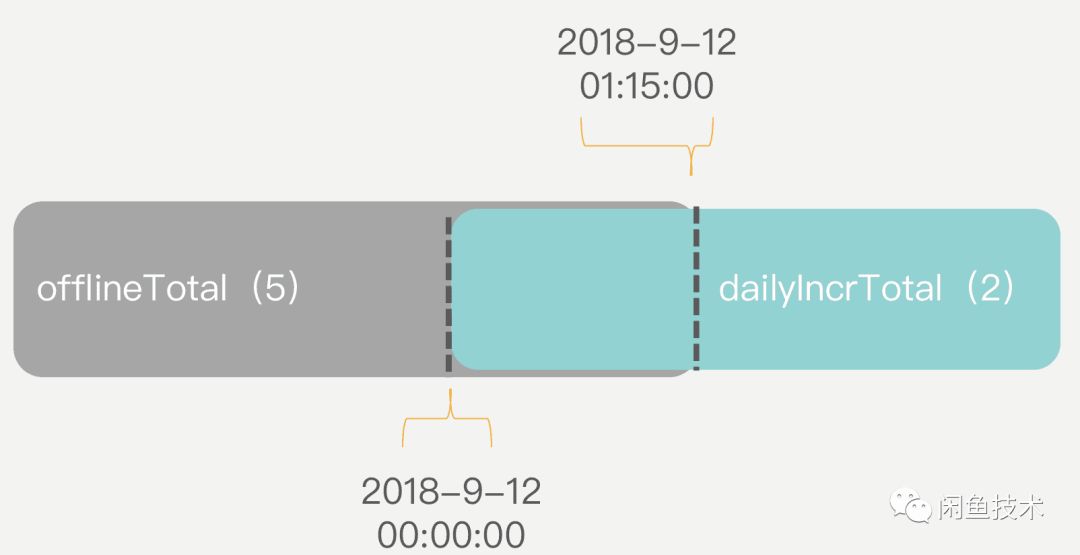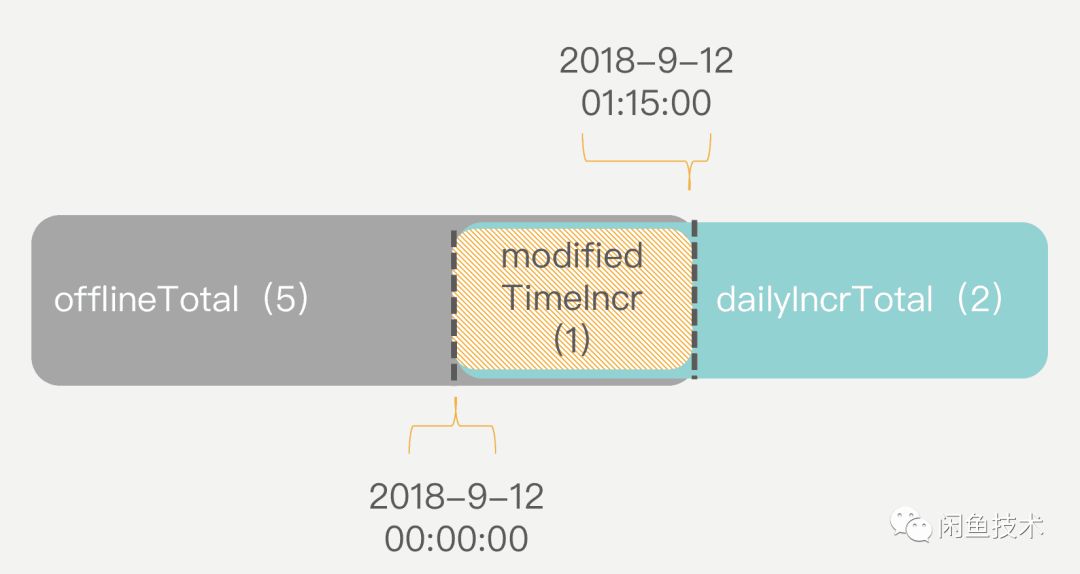 可以看到,由于离线任务统计的数据并不是严格按照时间点进行切割(通常离线任务会在每天凌晨0点至1点之间执行),离线计数值和当日增量之间会存在一些数据上的重合。此时,再根据离线计数值中的最新修改时间,取到在该时刻的增量,从合计值中去掉这部分数据即可: