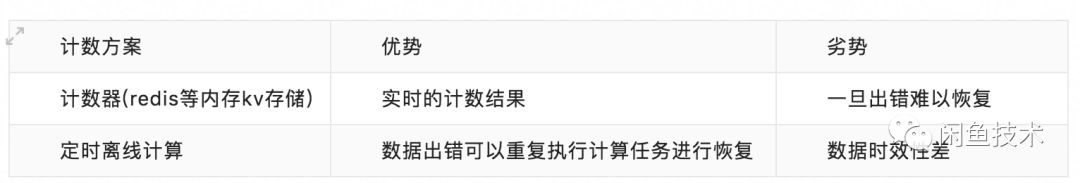 业内针对海量数据的计数场景,通常采用的解决方案有计数器和定时离线计算两种。两种方式各有优劣:
