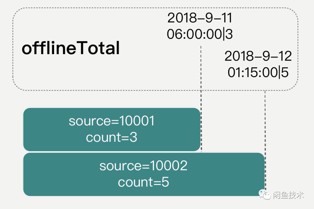 对不同source值计算后得到计数结果的同时,还可以得到该关系的最新更改时间,且不同关系的最新修改时间各不相同。本文将离线统计得到的包含该关系在某个时刻的最新计数值(所有关系中最新一条的修改时间+修改后的合计值),记做offlineTotal。与一般离线任务产出的结果不同的是,offlineTotal中额外包含了该关系的最新一条修改时间,下文中的在线增量数据统计方案,将基于此时间来完成数据的对接与合并。