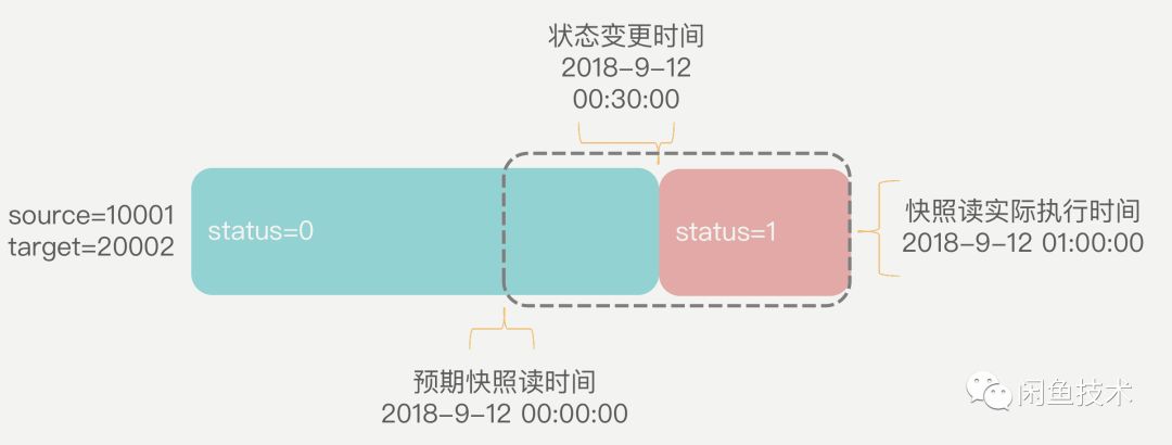 假设在预期快照读时间和快照读实际执行时间的间隔内产生了一条数据变化(在上图中,此变化具体是在凌晨30分时,该关系的状态从0变为了1),实际执行的快照读将无法读取到预期快照读时间的快照,而是最新的数据状态。换言之,