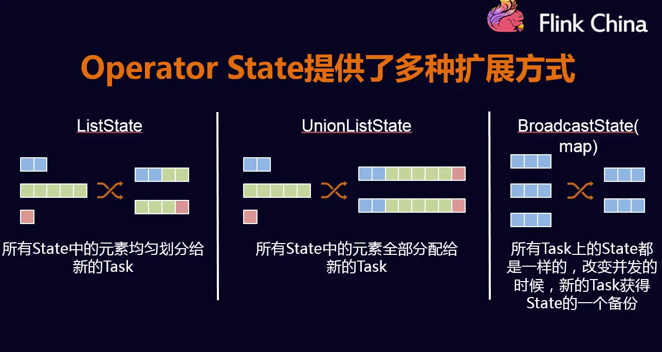 Operator States的动态扩展是非常灵活的,现提供了3种扩展,下面分别介绍: