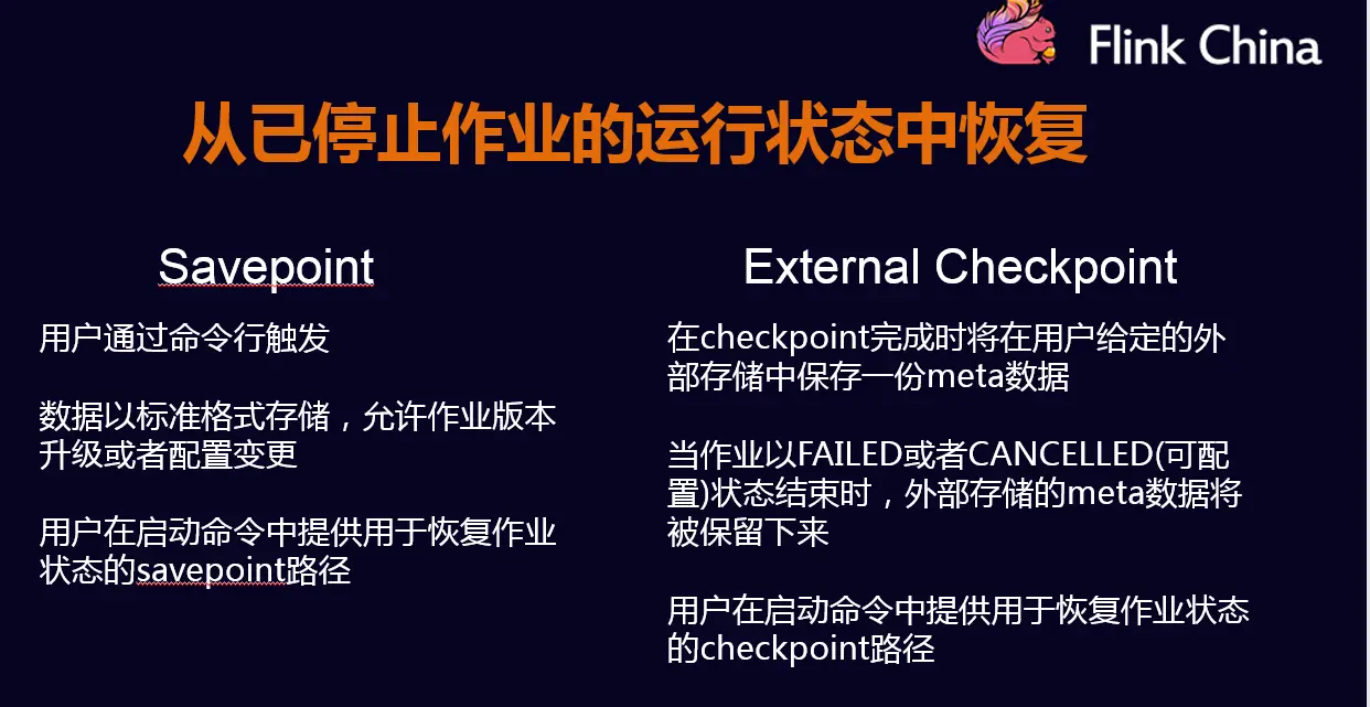 当组件升级的时候,需要停止当前作业。这个时候需要从之前停止的作业当中恢复,Flink提供了2种机制恢复作业: