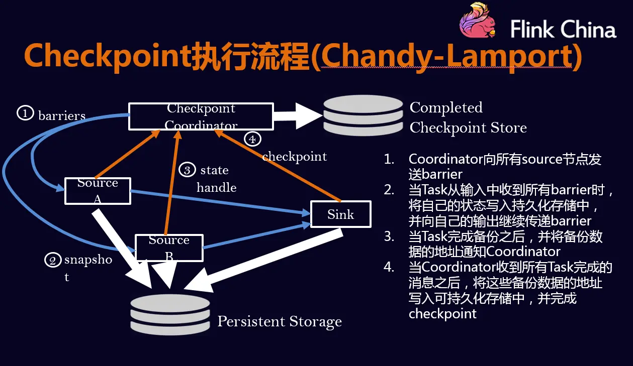 Checkpoint的执行流程是按照Chandy-Lamport算法实现的。