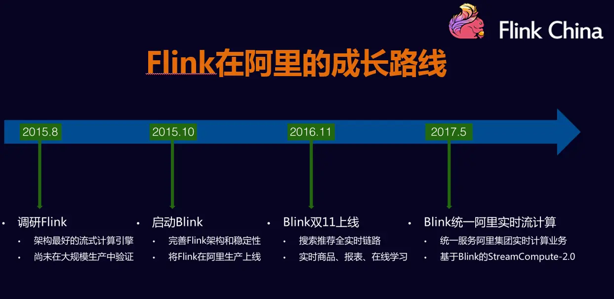 阿里是从2015年开始调研Flink,2015年10月启动Blink项目,并完善Flink在大规模生产下的一些优化和改进。2016年双11采用了Blink系统,为搜索,推荐,广告业务提供服务。2017年5月Blink已成为阿里的实时计算引擎。