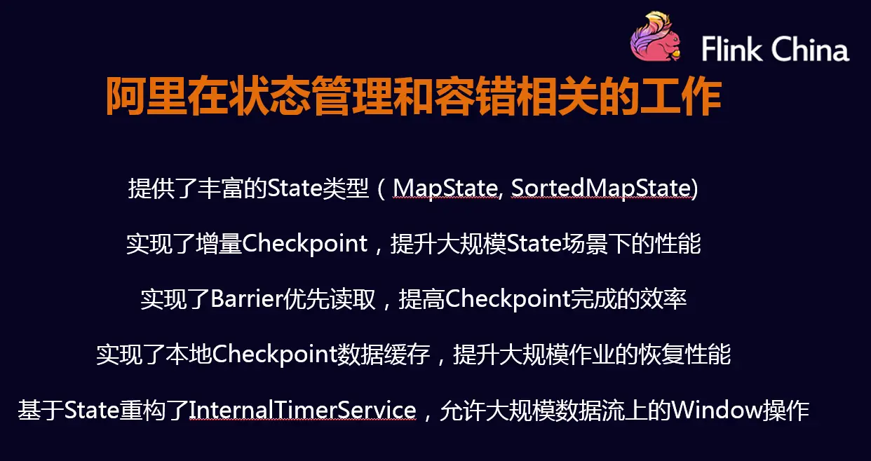 正在做的工作,基于State重构Window方面的一些优化,阿里也正在将功能做完善。后续将包括asynchronous Checkpoint的功能完善,并和社区进一步沟通和合作。帮助Flink社区完善相关方面的工作。