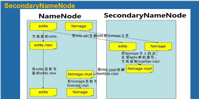 - SecondaryNameNode 通过HTTP Get方式从NameNode上获取到FsImage和EditLog文件并下载到本地目录