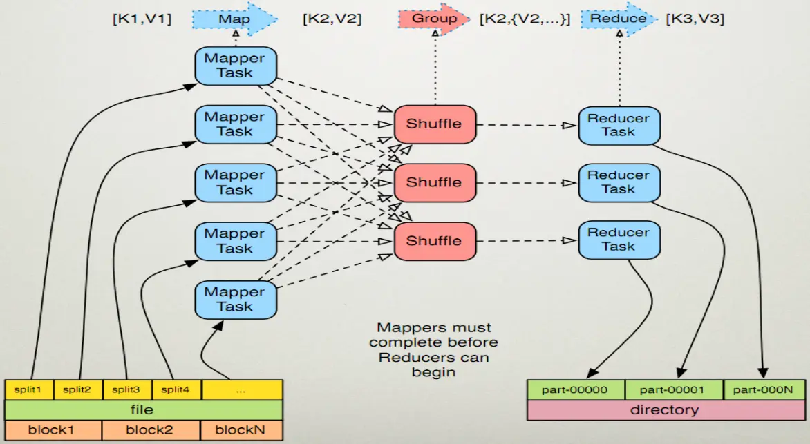 原语通常由若干条指令组成,用来实现某个特定的操作。通过一段不可分割的或不可中断的程序实现其功能。且常驻内存。但是这样一来,如果原语执行需要的开销超过了机器能给予的开销,则该原语在机器上无法执行,通常解决该问题的办法是增加机器配置,但计算机的配置在上层每提升一点所需要的资金都是翻倍的。因此根据分布式文件系统的原理,MapReduce诞生了。它将原语分成了两个步骤即map()和reduce(),同时两个阶段还可以分成多个模块在不同的机器上执行。