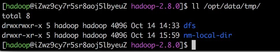 - 格式化时,这里注意hadoop.tmp.dir目录的权限问题,应该hadoop普通用户有读写权限才行,可以将/opt/data的所有者改为hadoop。