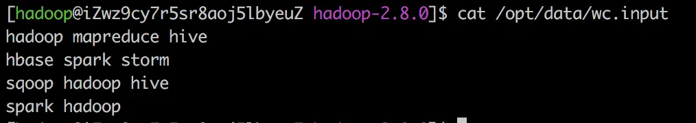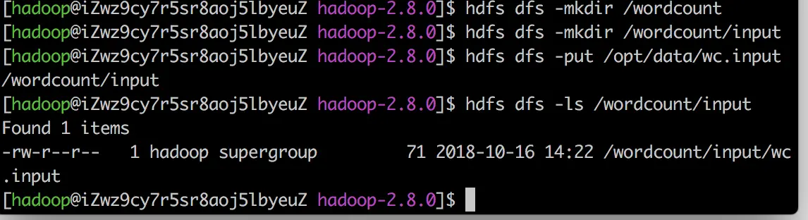 hdfs dfs -put /opt/data/wc.input /wordcount/input