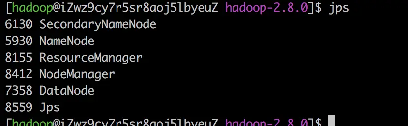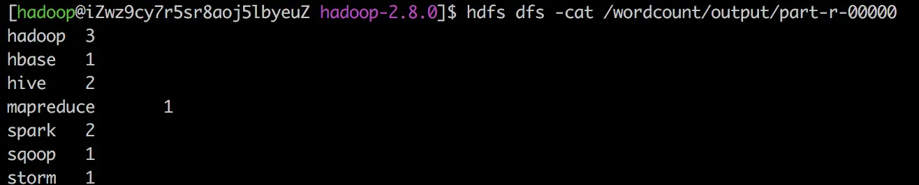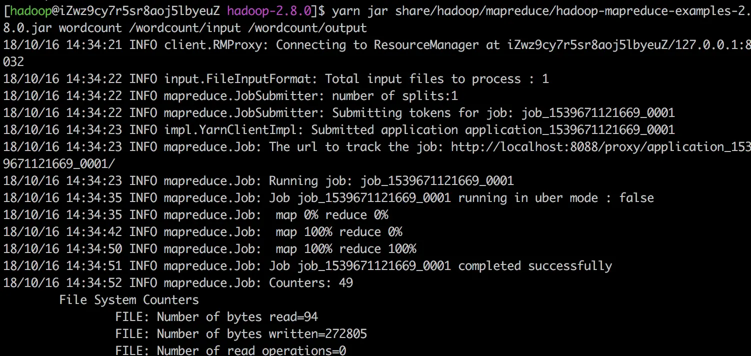 yarn jar share/hadoop/mapreduce/hadoop-mapreduce-examples-2.8.0.jar wordcount /wordcount/input /wordcount/output