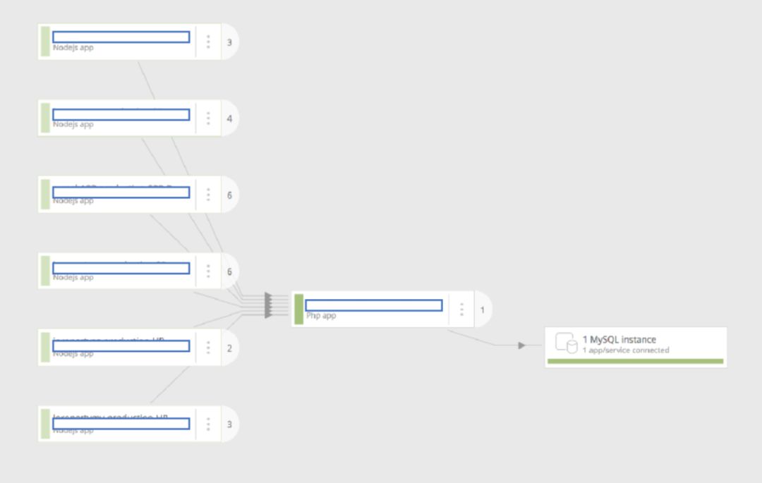 上图这是我们采用 NewRelic 做的微服务的监控,可以看到左边是一些业务系统,接着中间的微服务,最后右是数据库。为了保密,我把微服务的名字用蓝色的框覆盖了,你可以看到。这是一个 NodeJS + PHP 和 MySQL 的混合架构。
