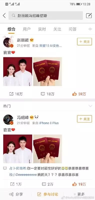 作为当红花旦和帅哥,二位流量明星都有众多粉丝,上午消息一出大家都强势围观,一时间微博热搜承载不住这么大的流量,热搜榜又挂了。有网友说,明星结婚的消息选择在微博第一时间发布,说明了微博才是国内第一媒体。