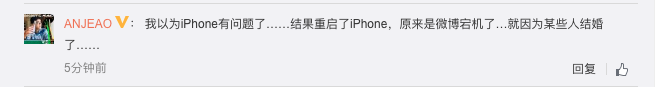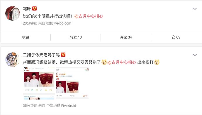 10 点左右二人发出消息的时候,微博手机端热搜榜已经瘫痪。微博已经很久没有这样瘫痪过,上一次微博出现这样的情况还是在鹿晗和关晓彤宣布恋情的时候,当时正是十一假期,微博的技术小哥还要加班加点,甚至在婚礼现场也要加班工作。